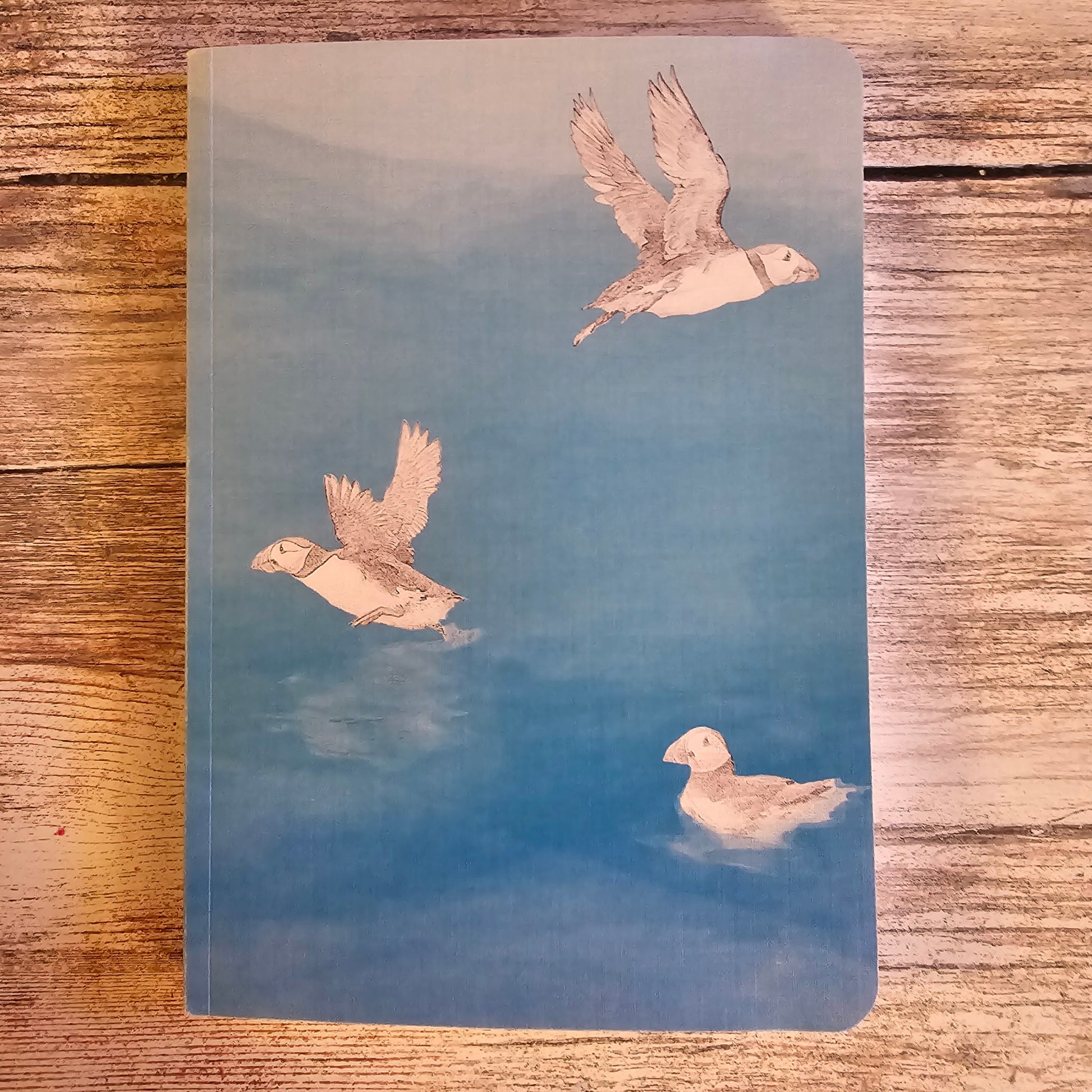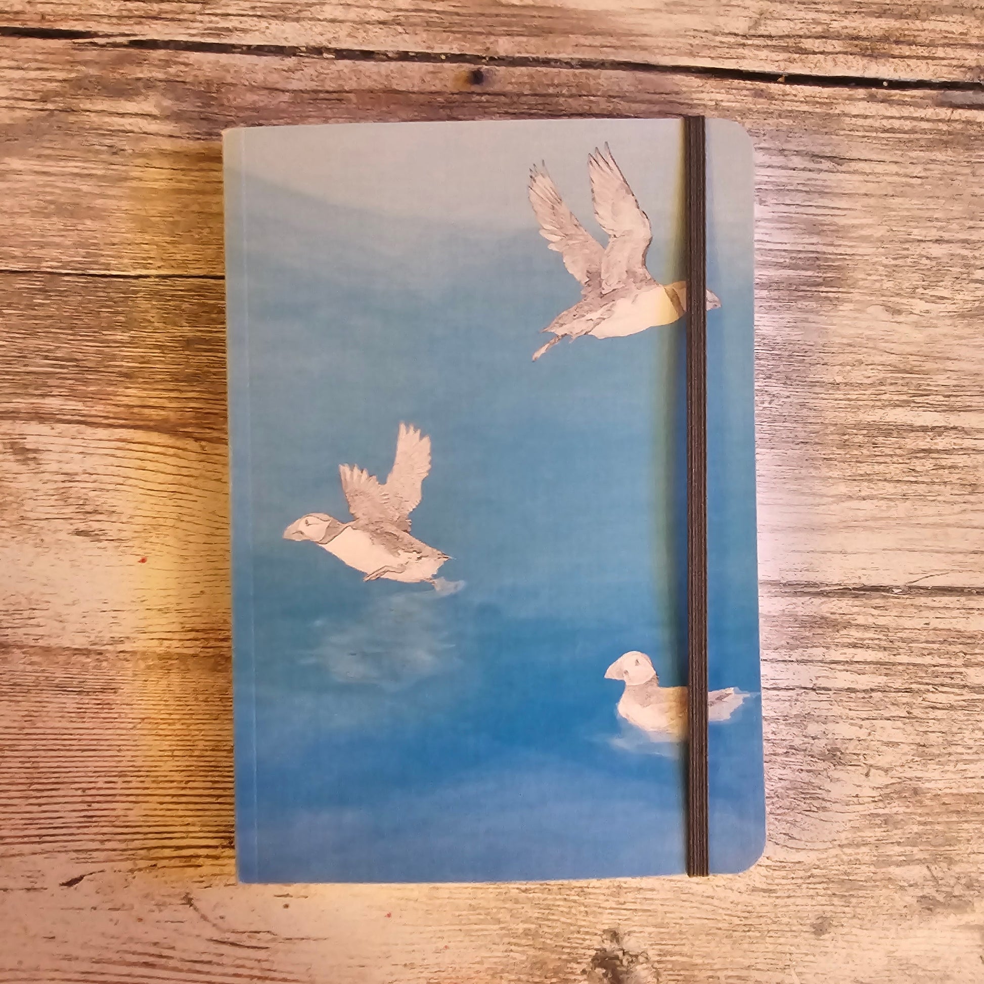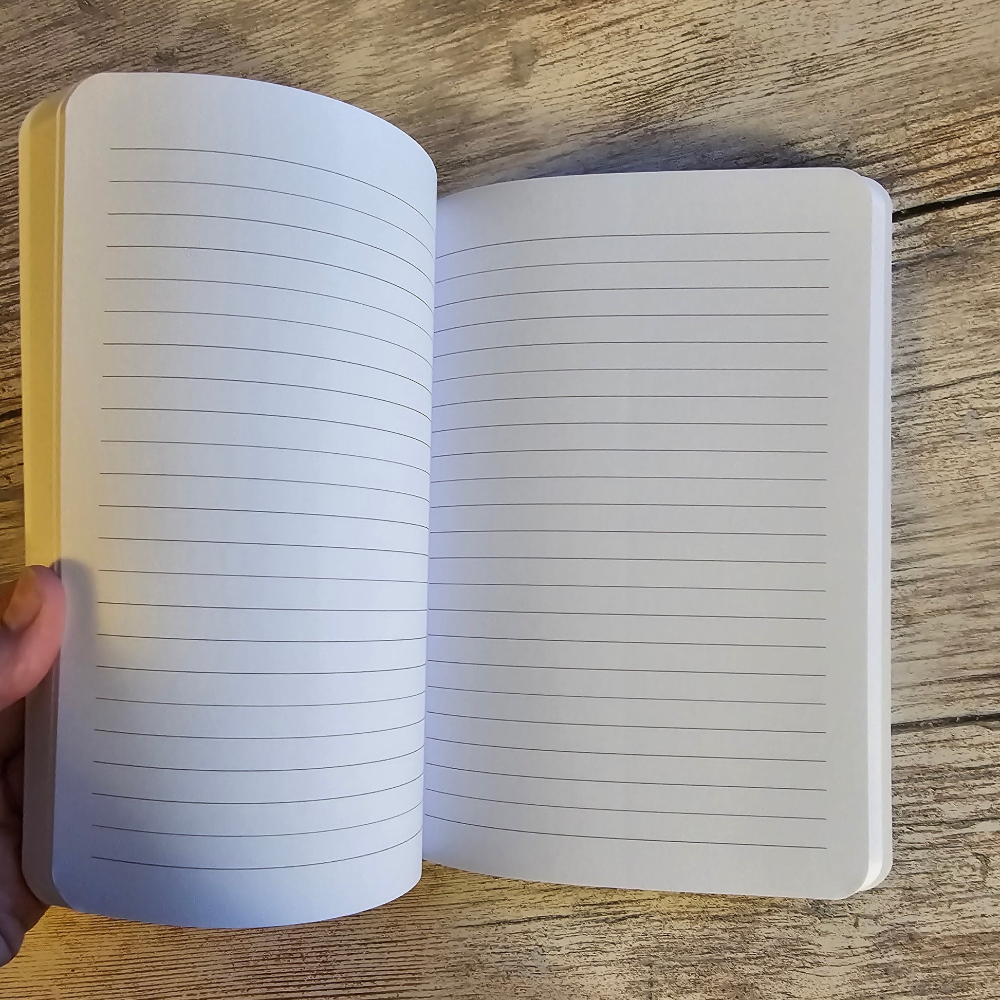 A slightly textured, soft back 192 page notebook with rounded corners and an elastic closure. lined pages.