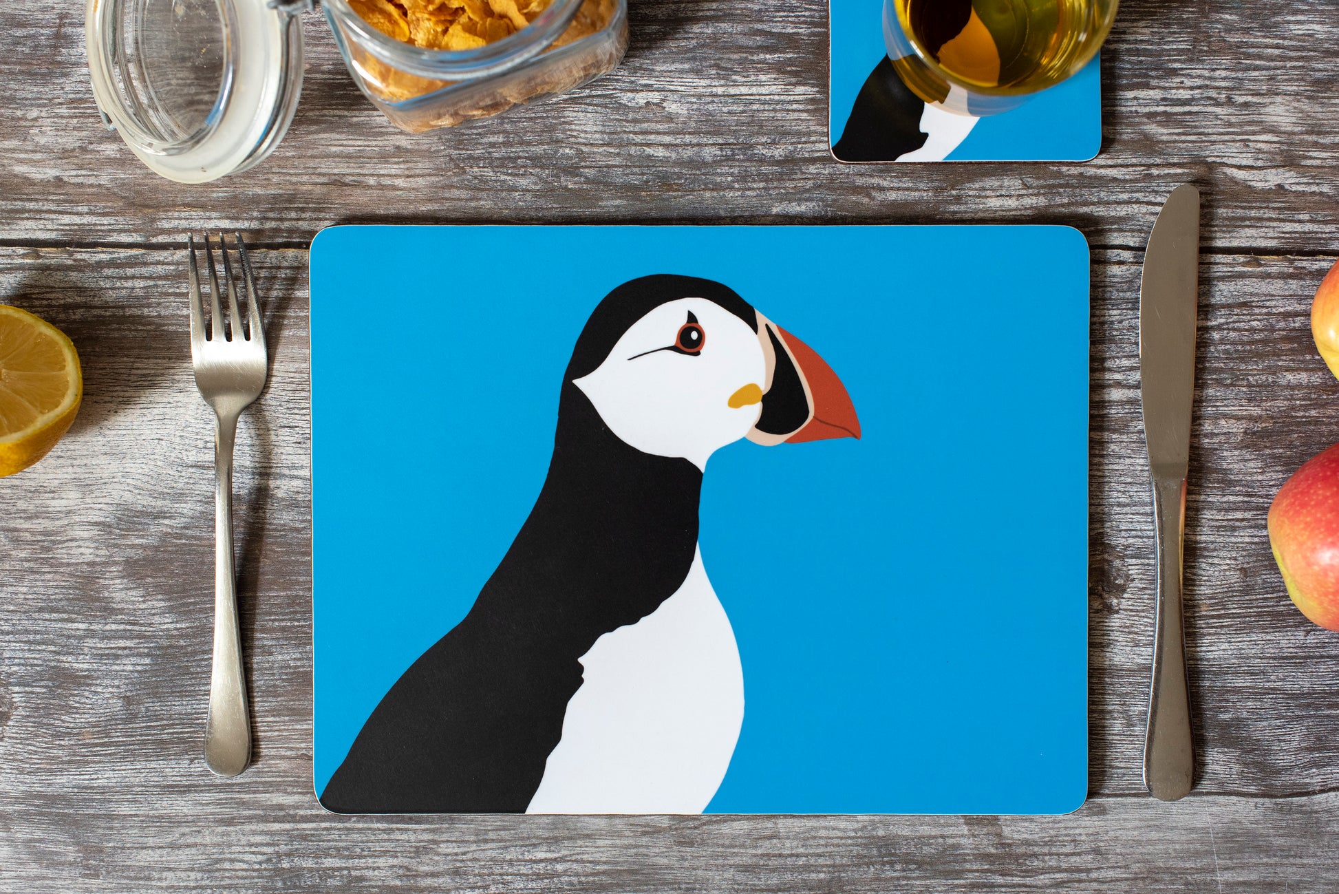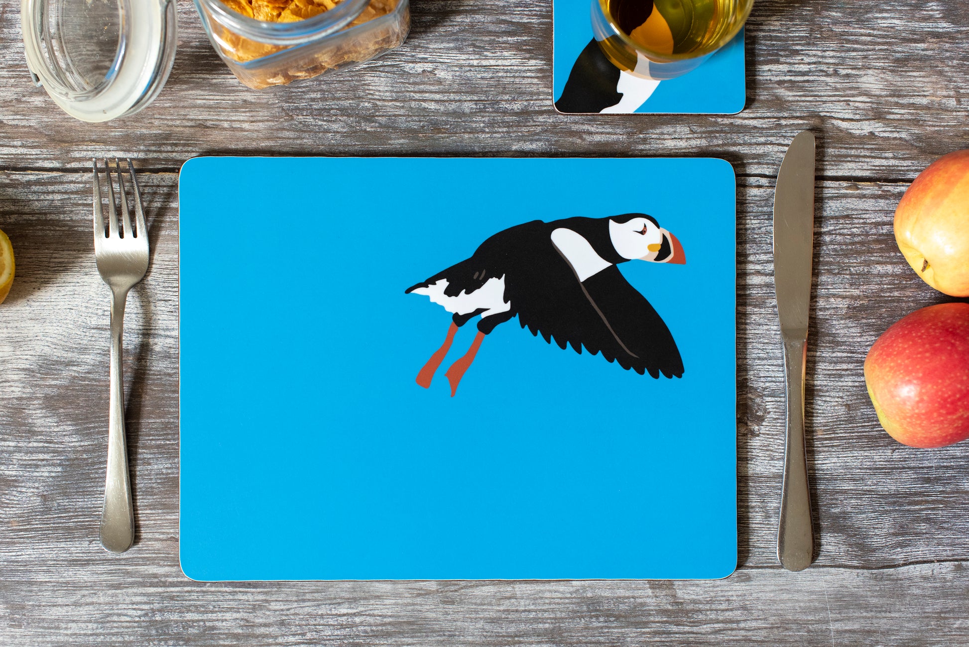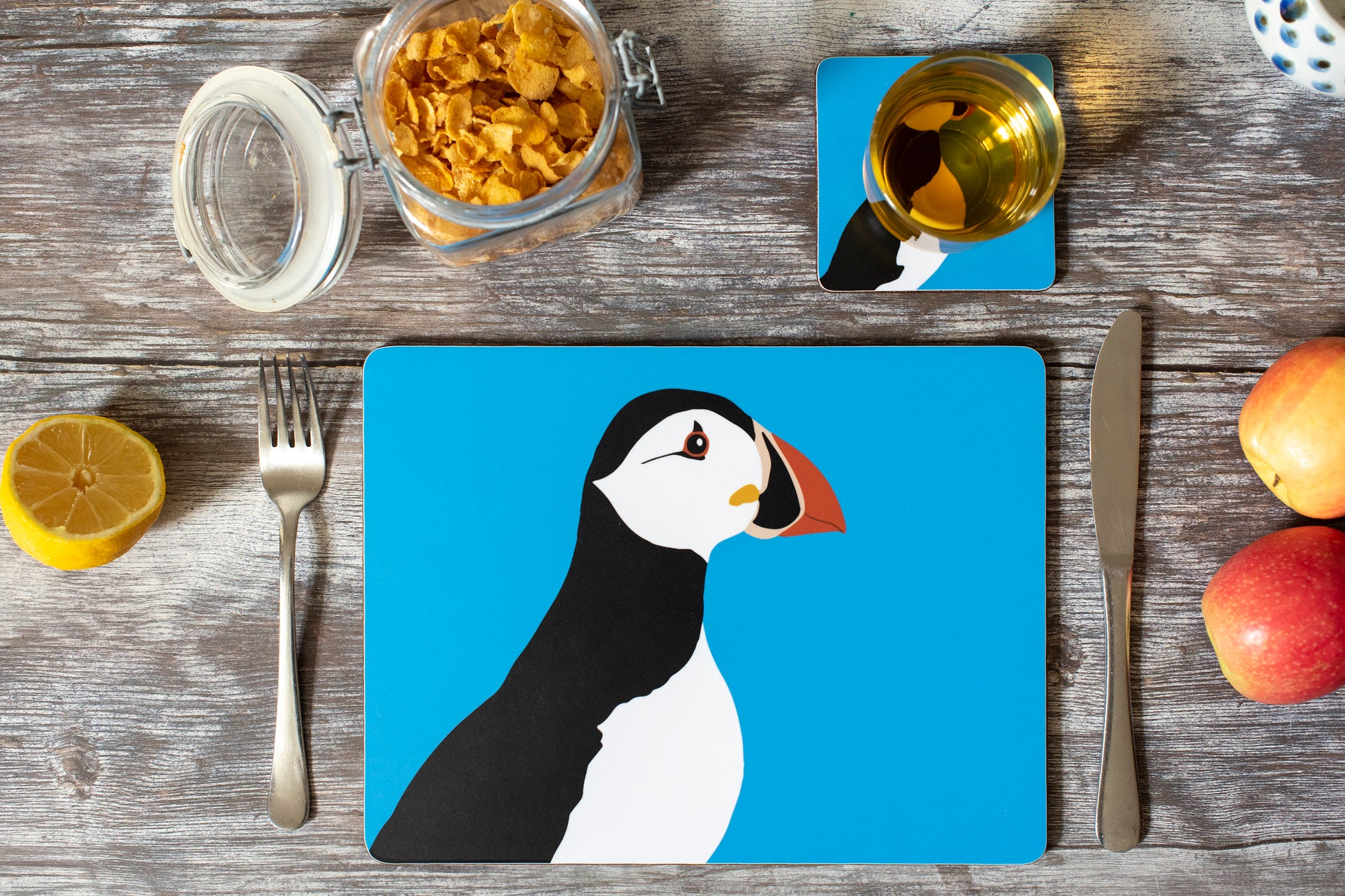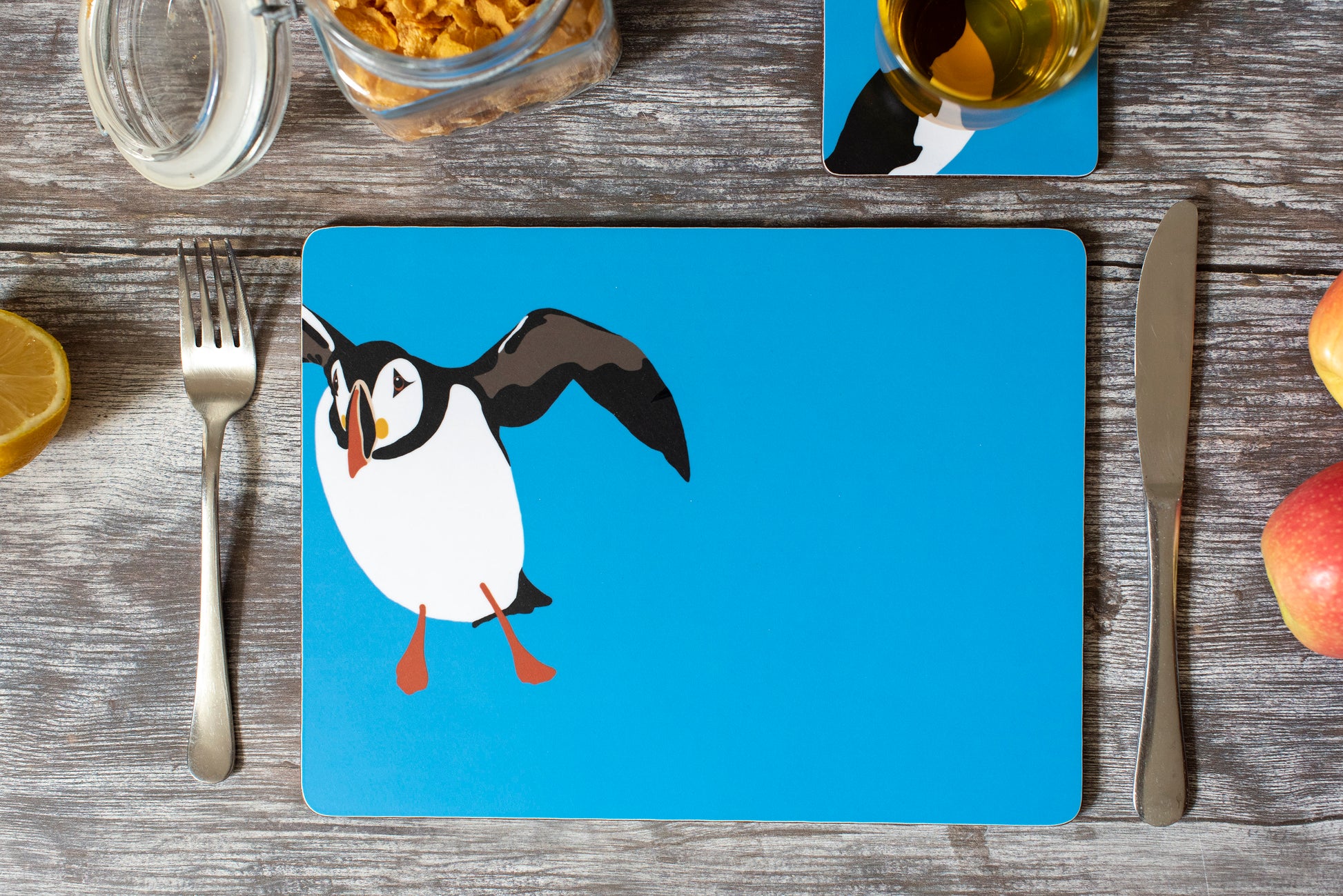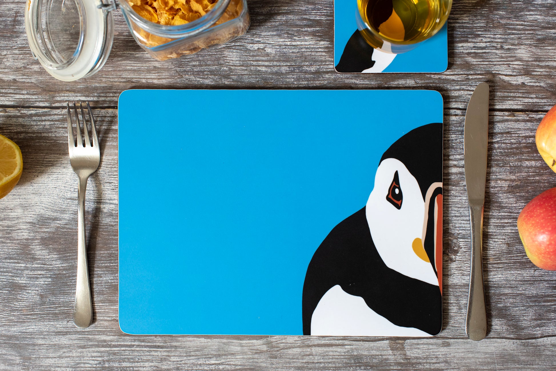 Set of 4 Scilly Puffins Placemats - high quality, cork backed melamine placemats with a hardwood core and domed and lacquered edges. Heat resistant to 140 degrees C and designed to stand the test of time. Each of the four placemats has a different puffin design in uniform style and colours.