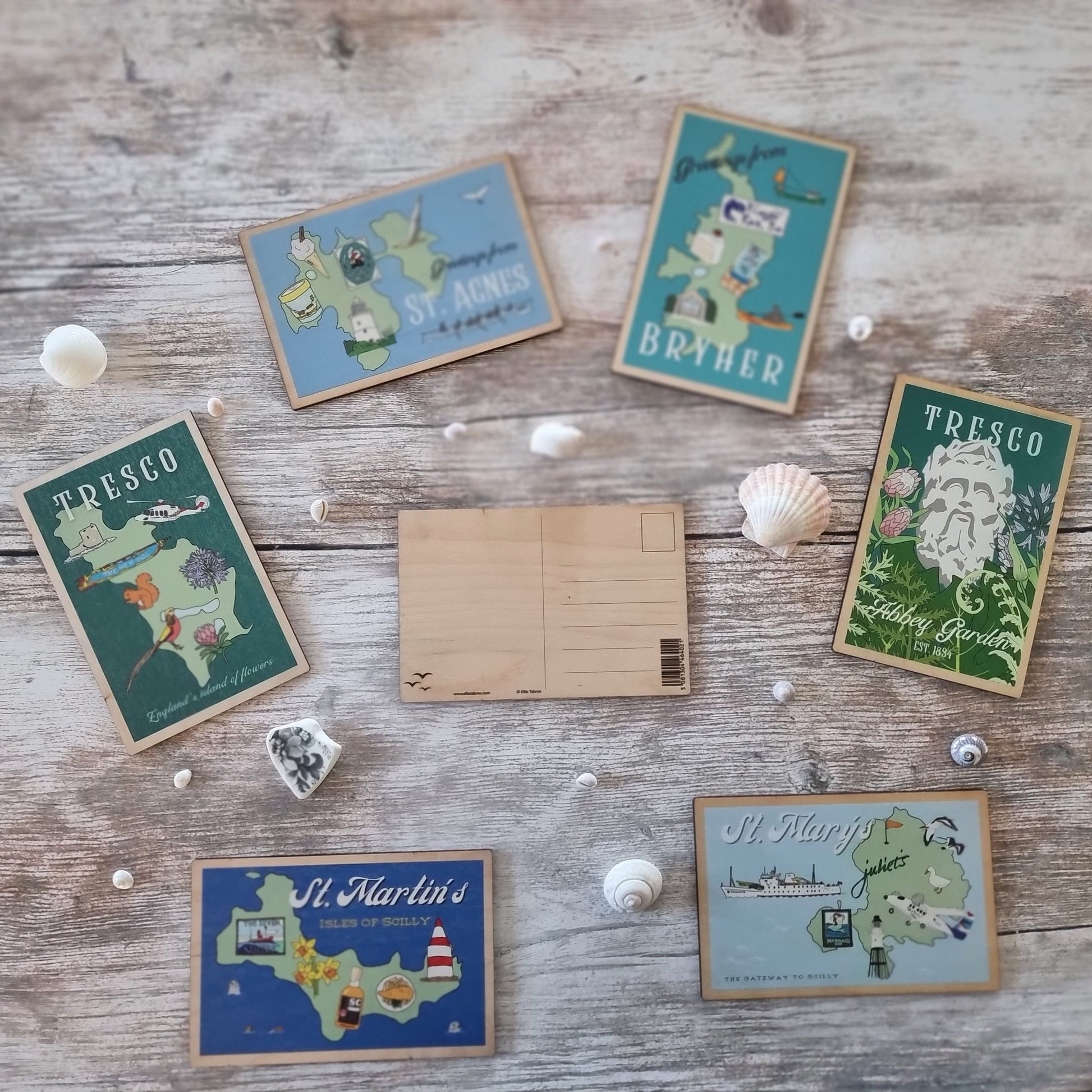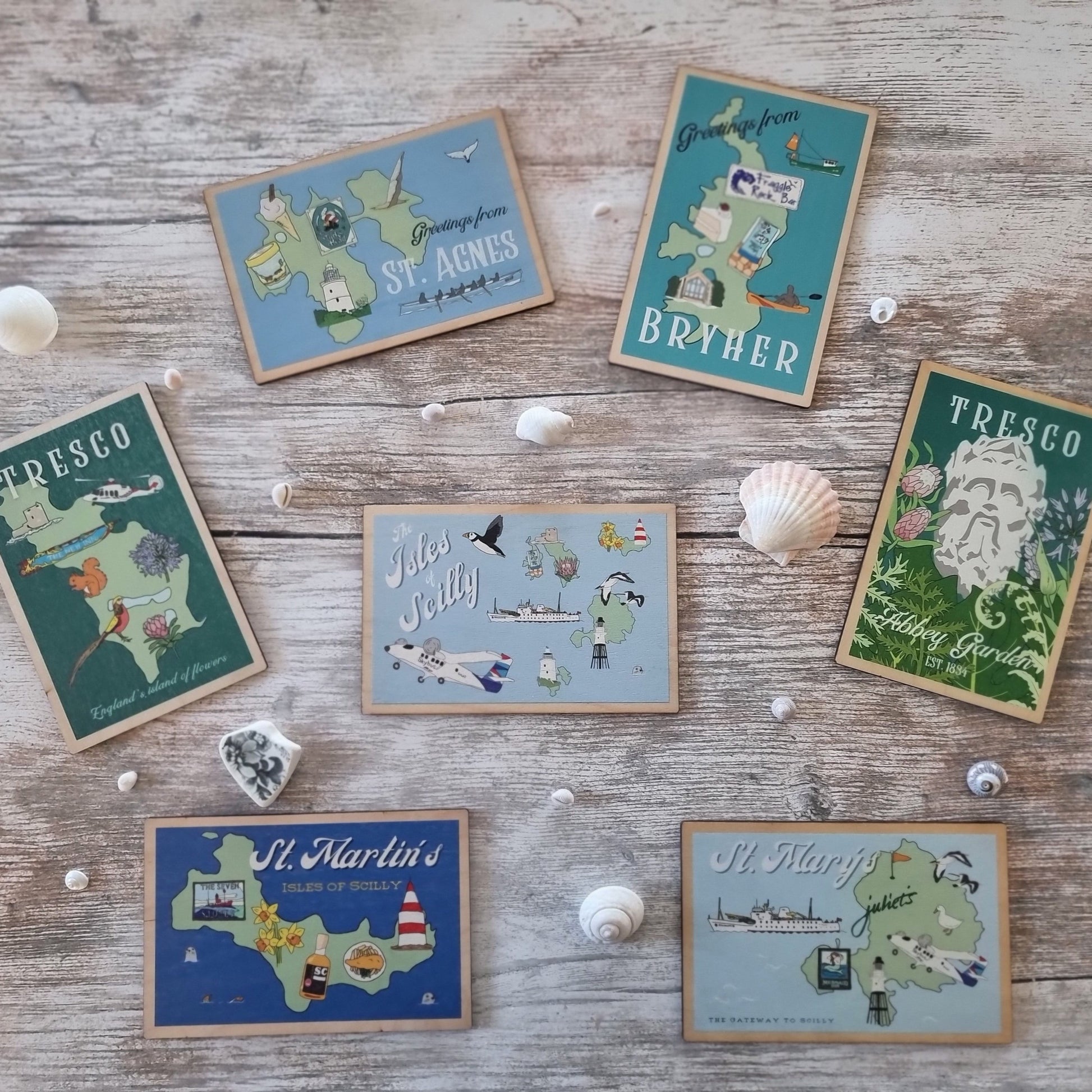 Illustrated wooden postcards featuring the islands and some of the things they are known for. Write on them in biro and send them in the post with an ordinary stamp, or pop them in a frame, its up to you!